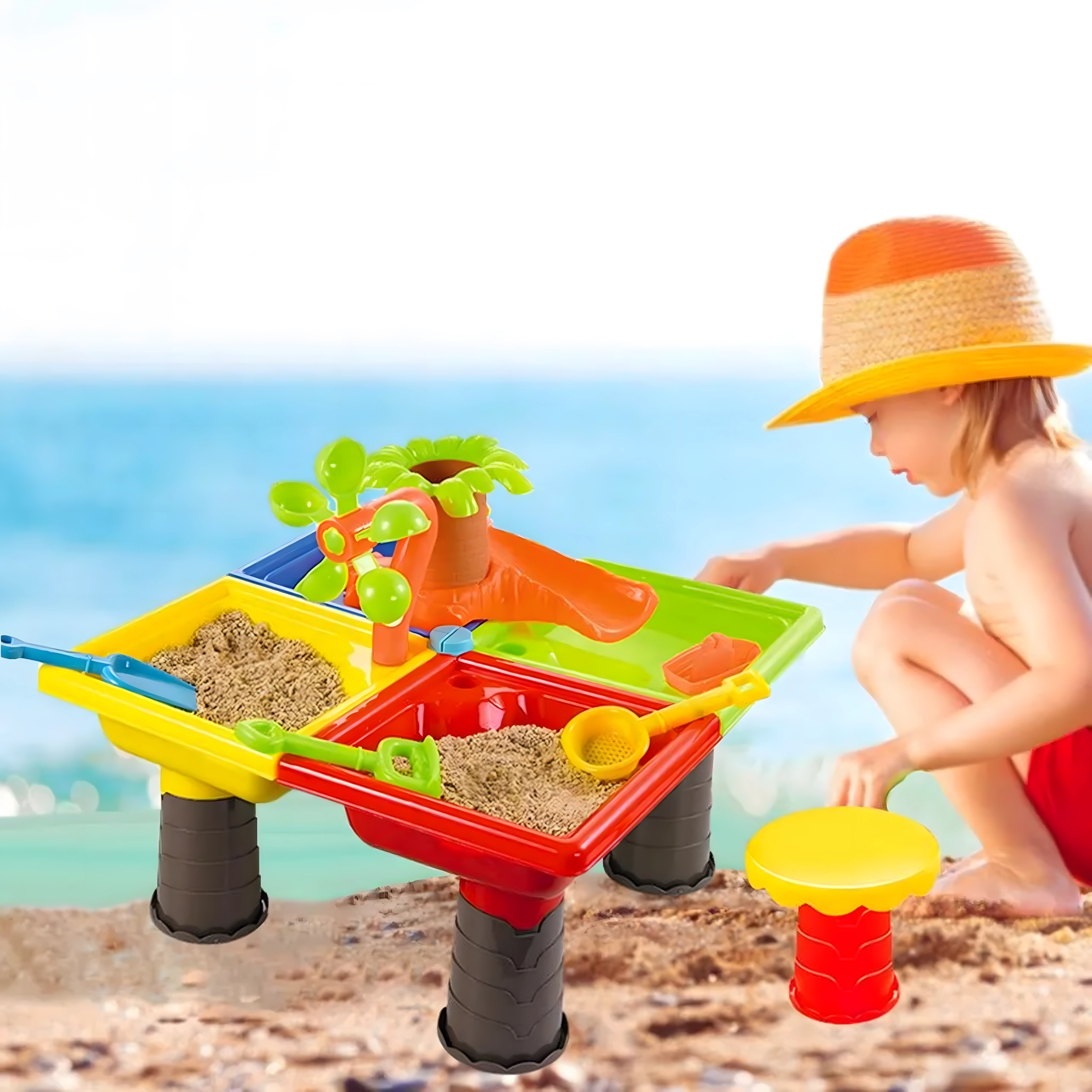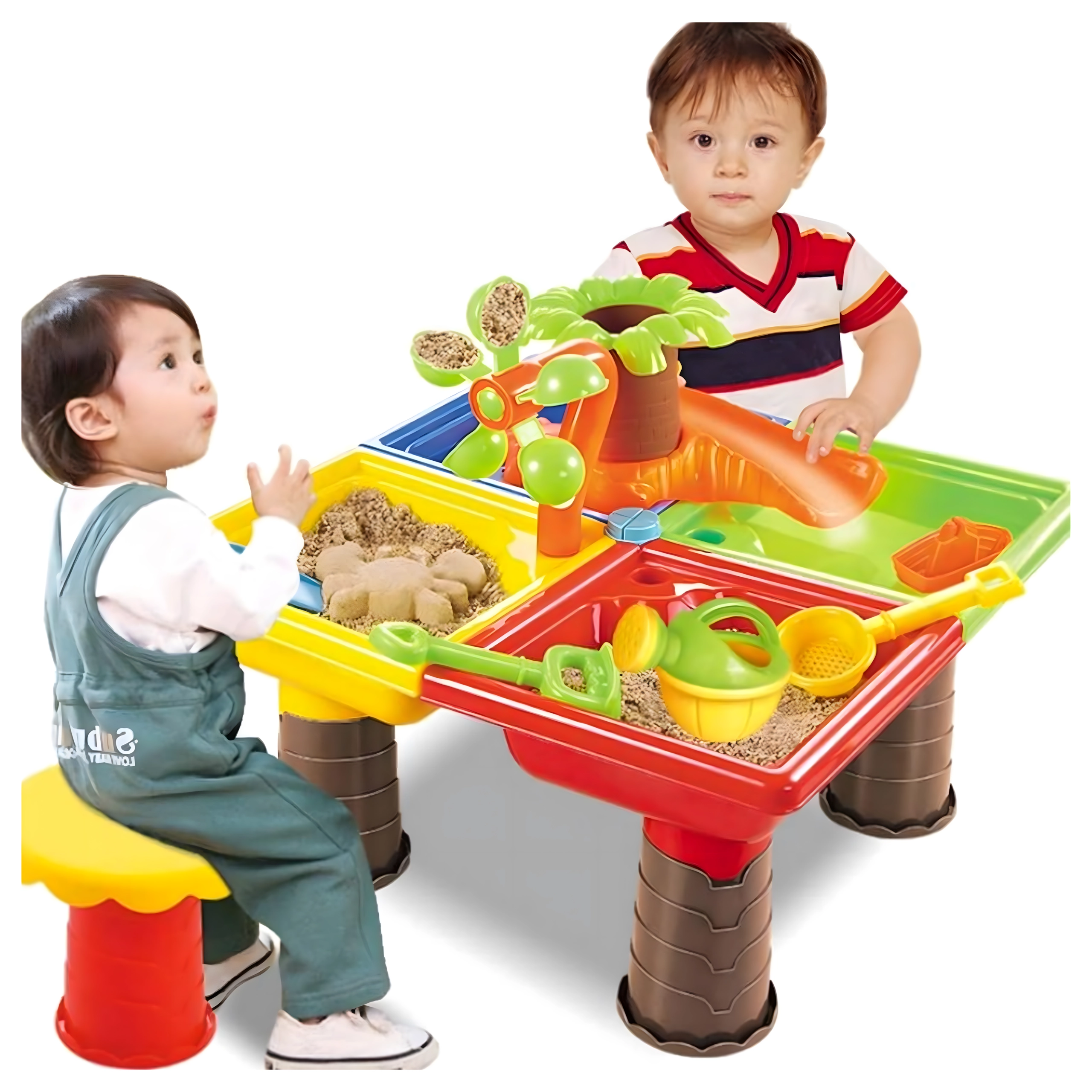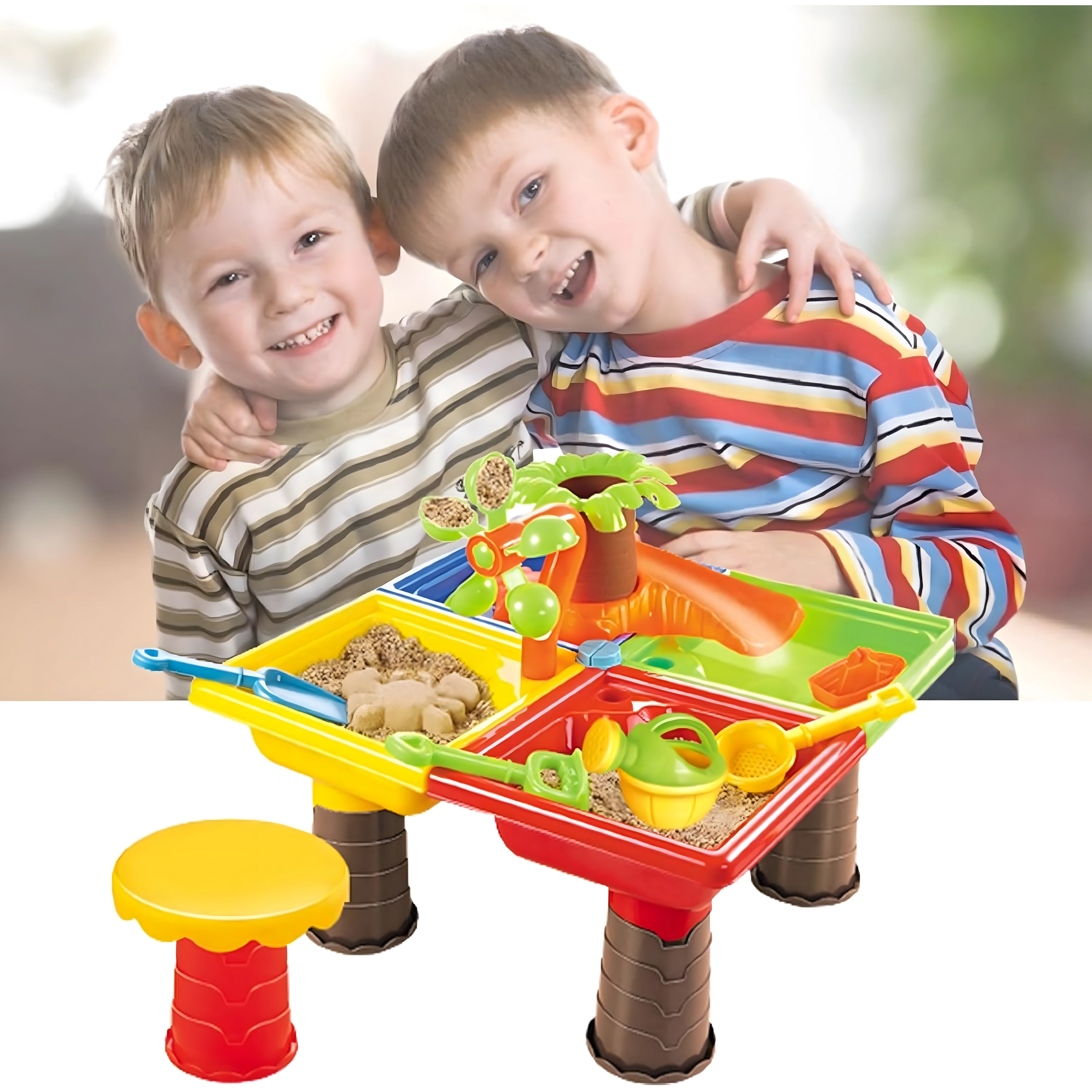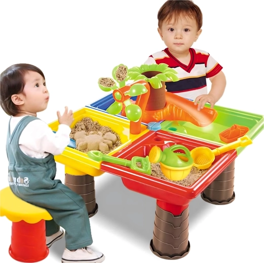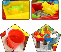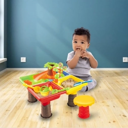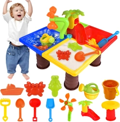 Der bunte 2-in-1 Wasser- und Sandtisch macht jeden Nachmittag zum Abenteuer. Enthält bis zu 25 Zubehörteile, darunter Gießkanne, Schaufeln, Harke, Förmchen, Rutsche und Hocker. Ideal für Garten, Strand und Terrasse, fördert sensorisches Spiel, Kreativität und Selbstständigkeit bei Kindern ab 3 Jahren.