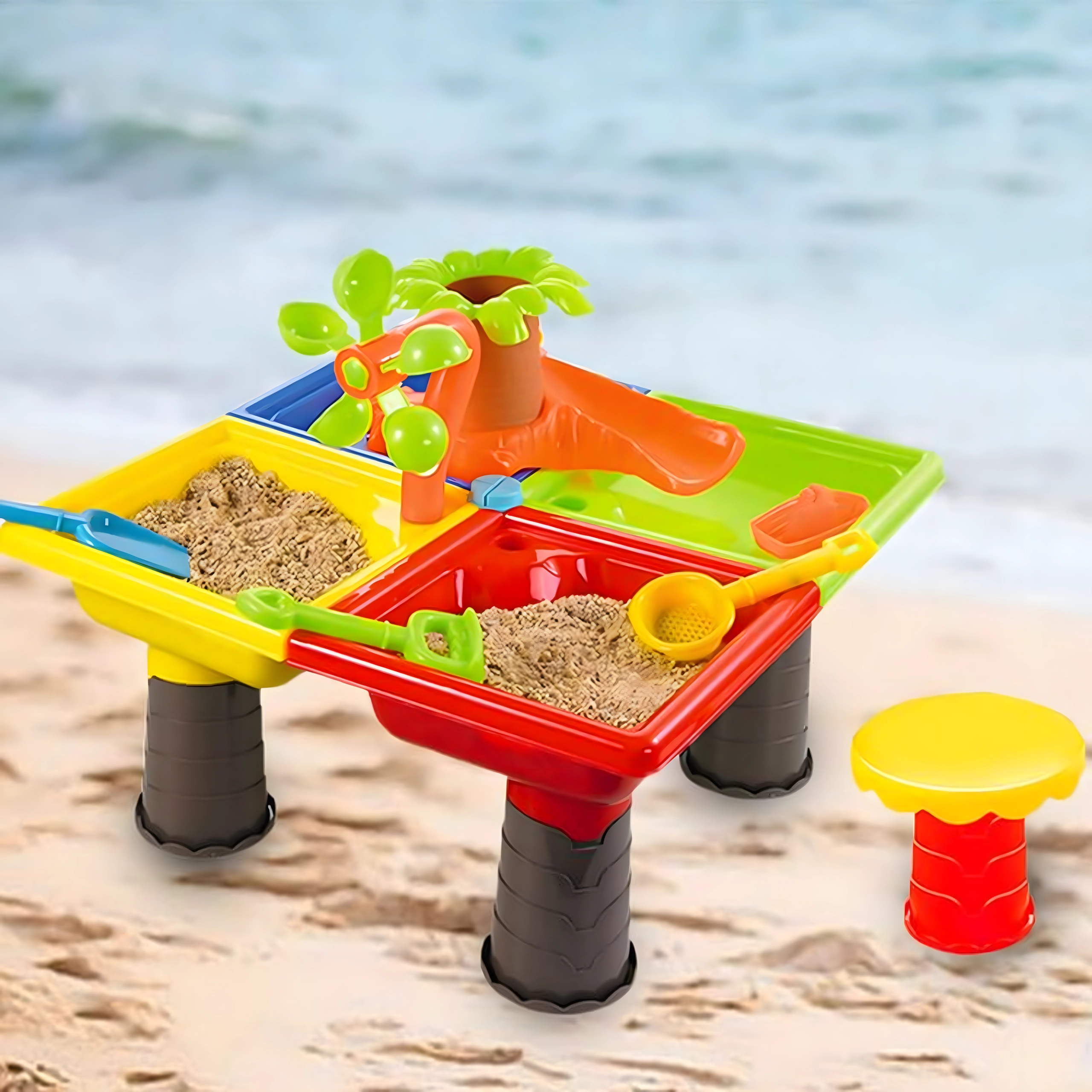 Dieser multifunktionale Wasser- und Sandtisch bietet Kindern stundenlange sensorische Unterhaltung. Vier Abteile ermöglichen die Kombination von Wasser- und Sandaktivitäten, während das zentrale Wasserelement mit „Palme“ und drehenden Rädern jedes Eingießen zum kleinen Spektakel macht. Die leichte, robuste Konstruktion ist einfach zu reinigen, und die stabilen Beine sorgen für sicheres Spielen draußen und drinnen.