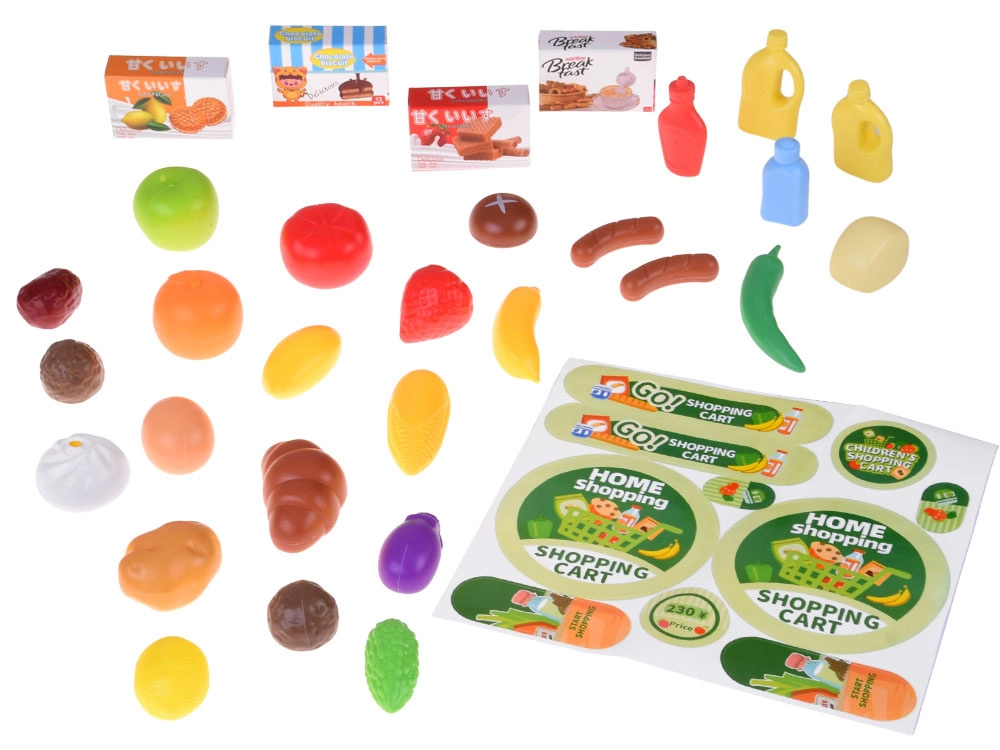 Enthalten sind Obst, Gemüse, Backwaren, Getränke, Schachteln und Aufkleber. So genießen Kinder realitätsnahes Einkaufen und das Sortieren von Lebensmitteln.