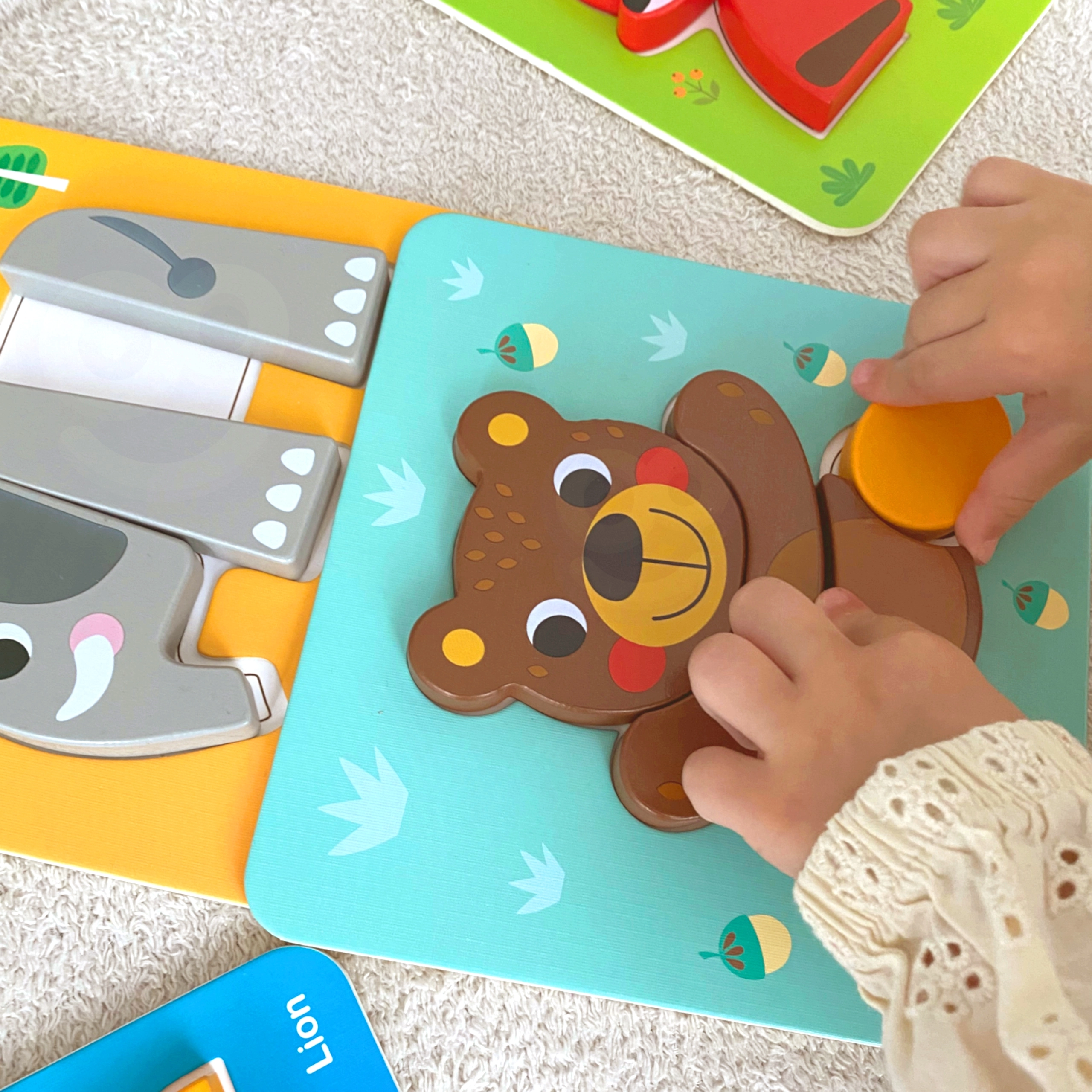 Bunte Tiermotive unterstützen die Erkennung von Farben und Formen sowie den Wortschatzaufbau. Kinder trainieren Hand-Auge-Koordination und Geduld.