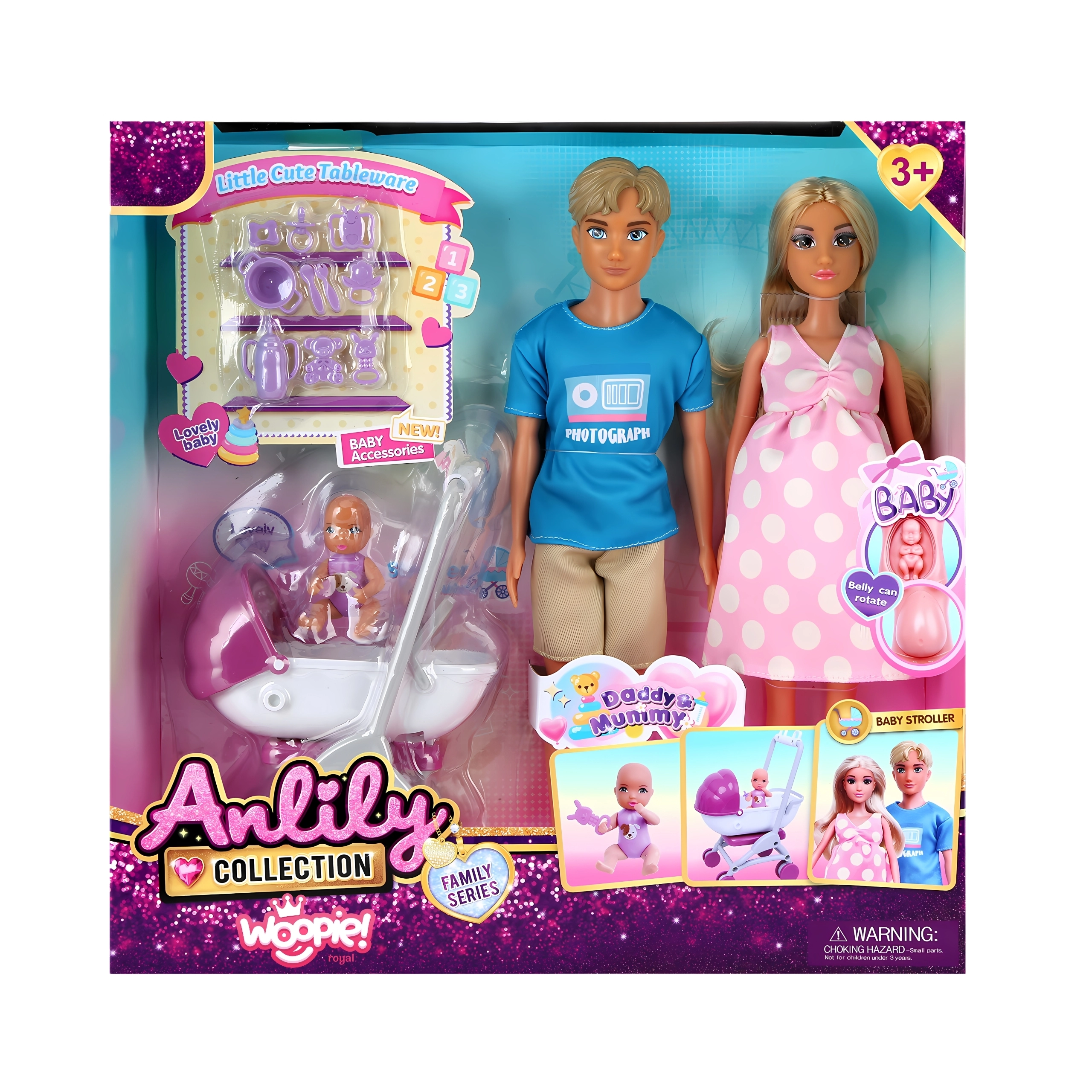 Entdecken Sie den Zauber von Familiengeschichten mit dem detailreich gestalteten WOOPIE Puppenset. Kinder können Alltagssituationen nachspielen – von der Babypflege bis zu Familienausflügen mit dem Kinderwagen. Die Mama hat ein herausnehmbares Baby im Bauch, der Papa trägt ein modernes Hemd und das Baby kann bequem im funktionalen Kinderwagen gefahren werden. Außerdem enthalten sind praktische Accessoires zum Füttern und Pflegen, die das Spiel besonders realistisch machen.
