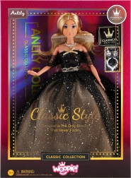 Entdecken Sie die Welt von Mode und Eleganz mit der Puppe Lily von Woopie. Ihr atemberaubendes Kleid in Schwarz‑Gold ist mit unzähligen Pailletten verziert, die wunderschön glitzern. Die langen goldblonden Haare laden zum Kämmen, Flechten und Kreieren origineller Frisuren ein.