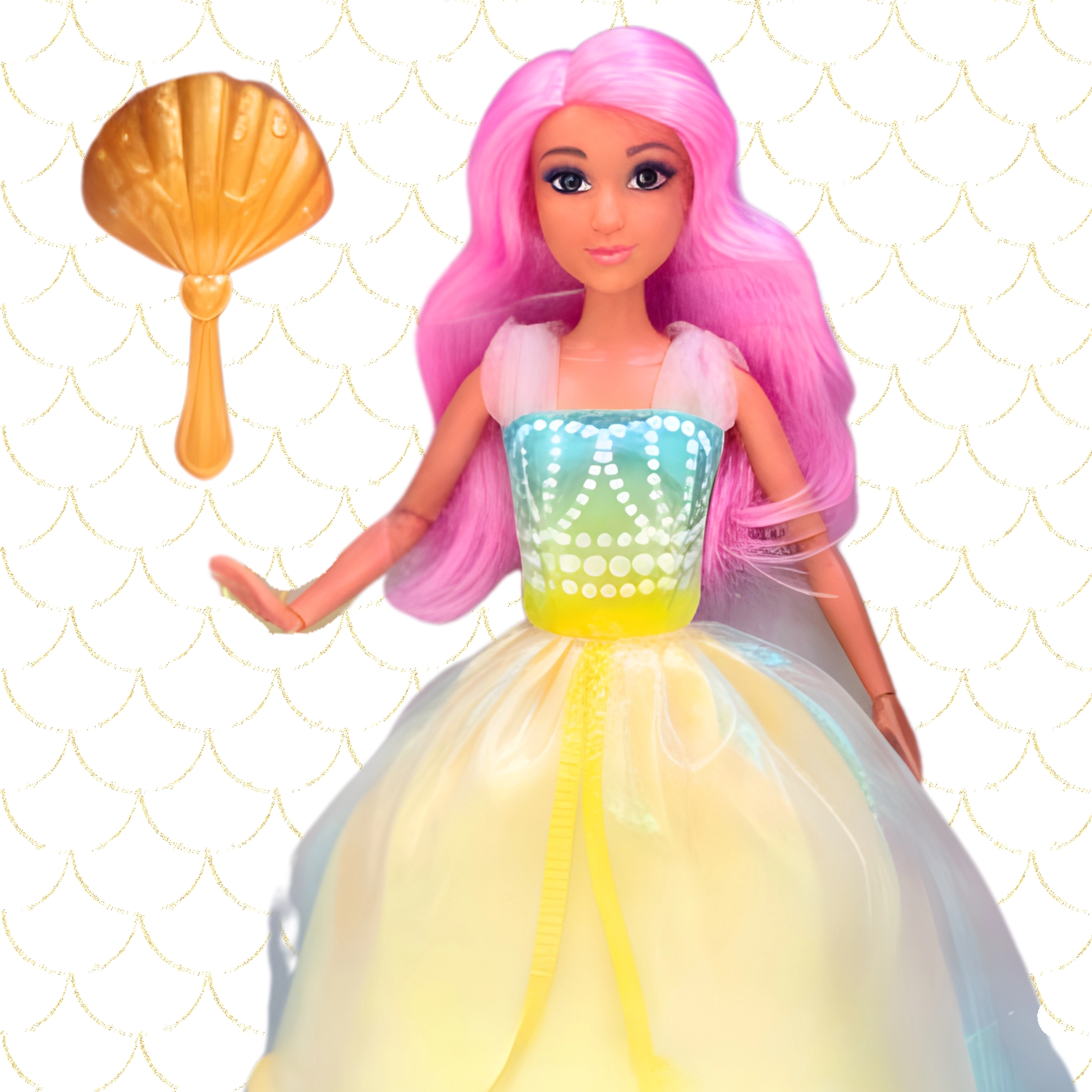Zum Set gehören ein goldener Kamm in Muschelform und ein eleganter Ring, die den Stil abrunden und Rollenspiele unterstützen. Die Puppe ist ideal für Kinder ab 3 Jahren und hilft, Feinmotorik, Vorstellungsvermögen und Erzählfreude zu entwickeln.