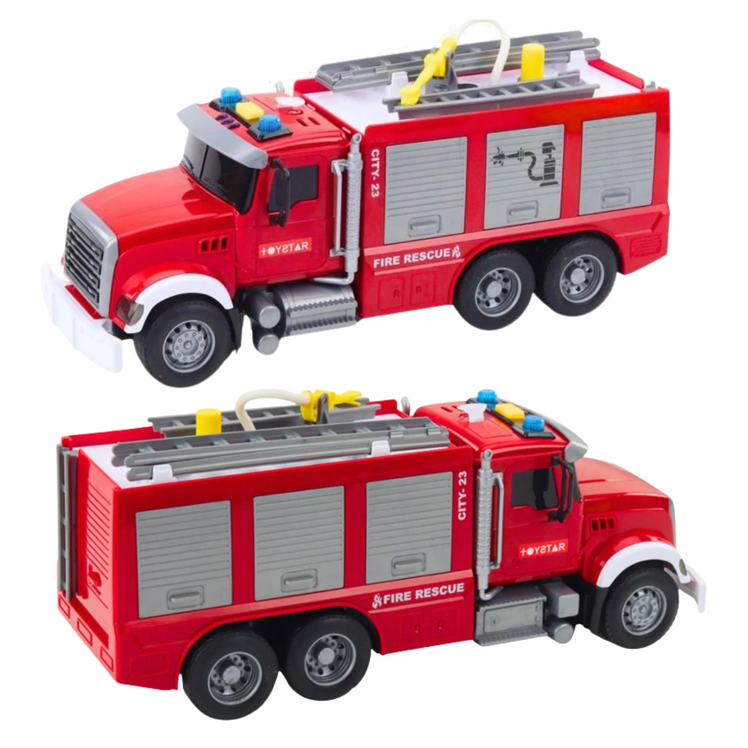 Der realistische Feuerwehrwagen für kleine Retter bietet viele Funktionen, die sofort begeistern. Füllen Sie den Tank, drücken Sie die Pumpe und starten Sie den echten Wasserstrahl. Für authentische Atmosphäre sorgen Lichteffekte sowie Sirenen- und Hupengeräusche. Mit der ausziehbaren Leiter und dem Ausleger mit Düse lassen sich actionreiche Rettungseinsätze spielend inszenieren.