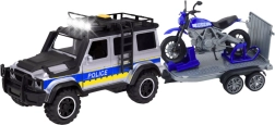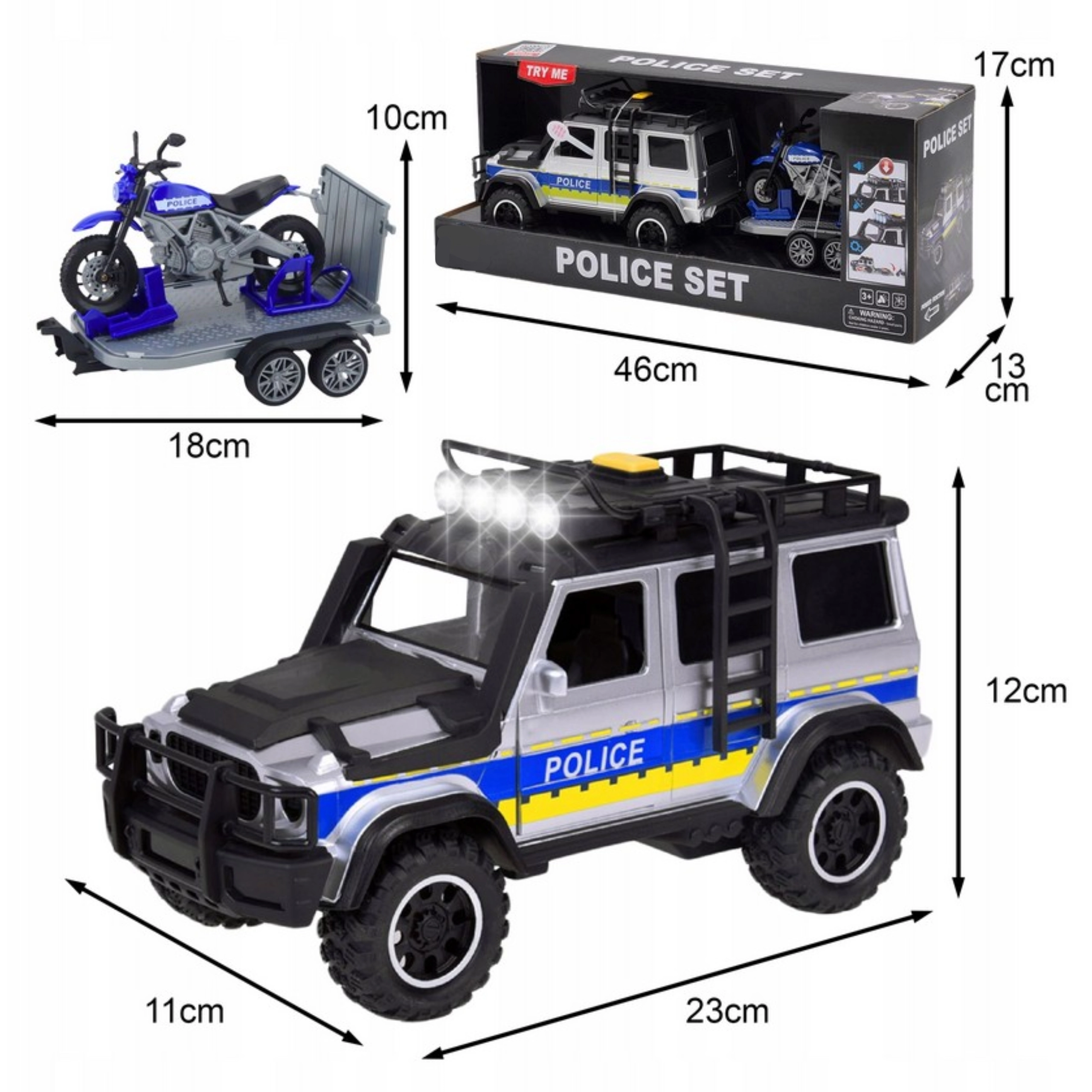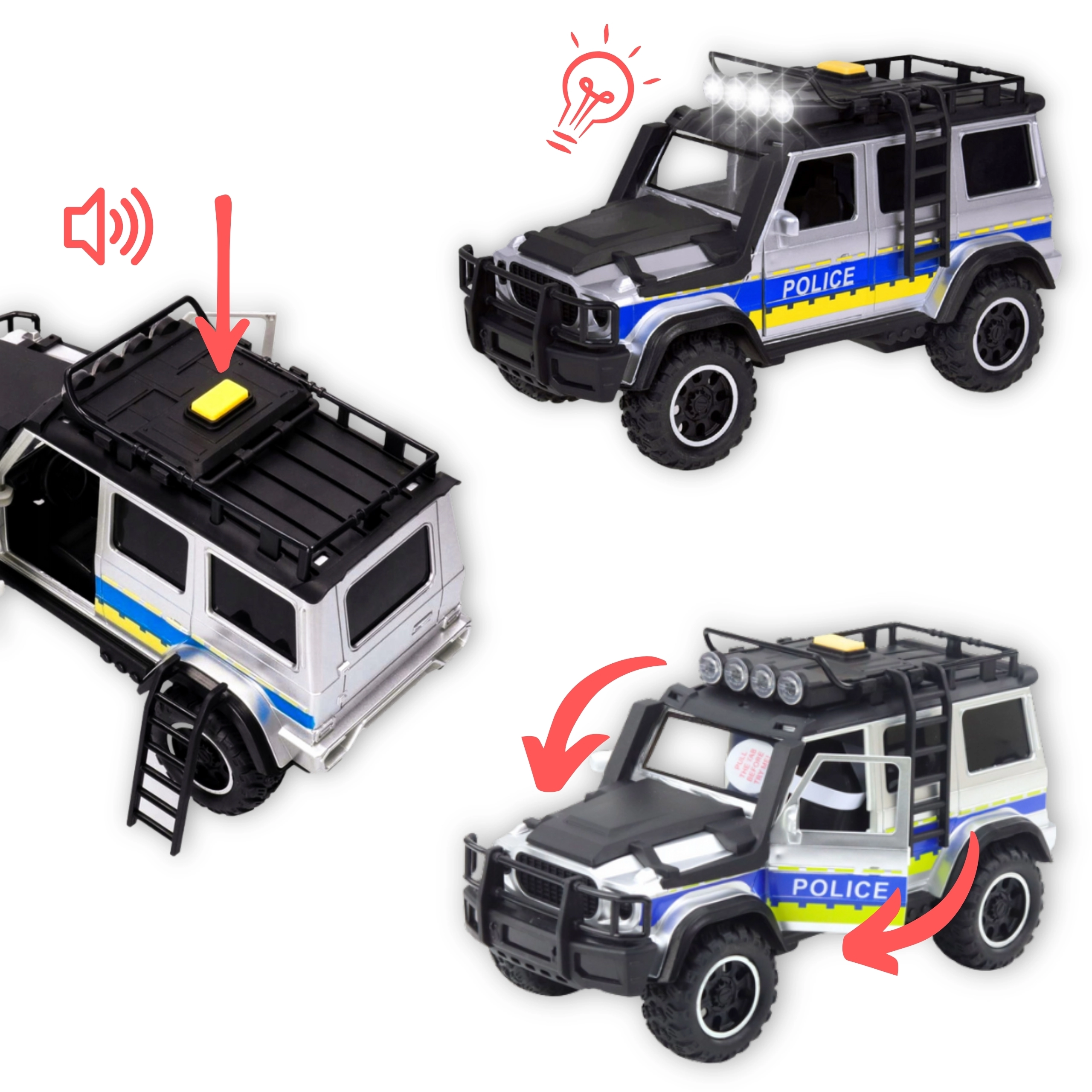 Das WOOPIE-Polizeiset verbindet robuste Ausführung mit zahlreichen Funktionen, die die Vorstellungskraft anregen. Der große Geländewagen mit Licht- und Soundeffekten bildet Einsätze im Gelände realistisch nach, während der Anhänger mit Motorrad schnelle Aktionen auch an schwer zugänglichen Orten ermöglicht. Öffnende Türen und das bewegliche Motorrad steigern die Interaktivität und sorgen für ein realistisches Spielerlebnis.