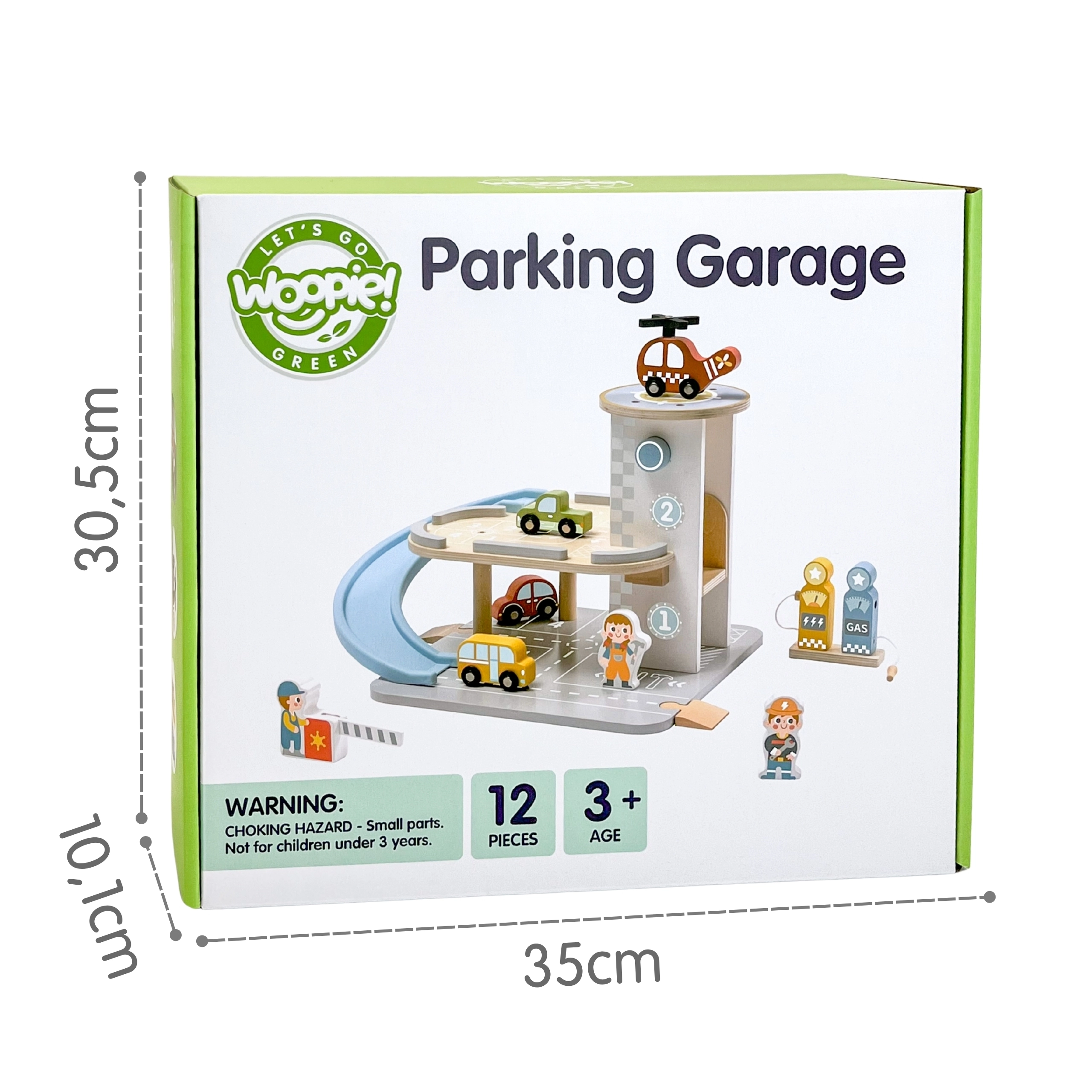 Das hölzerne 2-in-1-Parkhaus kombiniert eine Garage auf zwei Ebenen und eine Tankstelle, damit Kinder Fahren, Parken und Tanken nachspielen können. Die Autos sausen die blaue Spiralrampe hinunter, der Hubschrauber mit drehendem Rotor landet auf dem Dachheliport und das Servicepersonal kümmert sich um den Betrieb. Hochwertige Verarbeitung aus Holz und eine stabile Basis gewährleisten sicheres Spielen ab 3 Jahren.