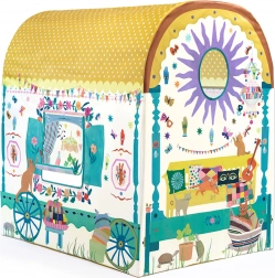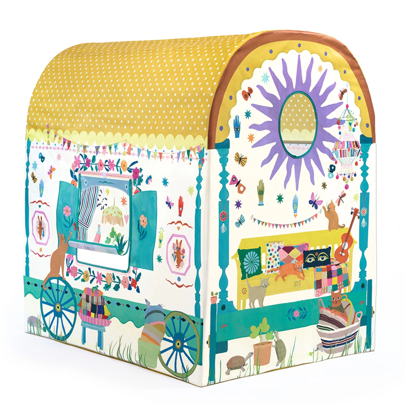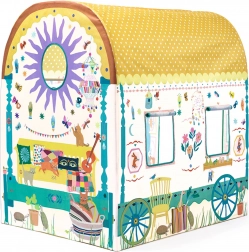 Dieses geräumige DJECO-Spielzelt im Wohnwagen-Stil bietet Kindern ihren eigenen geheimen Platz zum Lesen, Ausruhen und kreativen Spielen. Dank des abgerundeten, gepunkteten Dachs, der bedruckten Fenster und fröhlichen Dekorationen wirkt es wie ein kleines Häuschen, das jedes Kinderzimmer wunderschön ergänzt.
