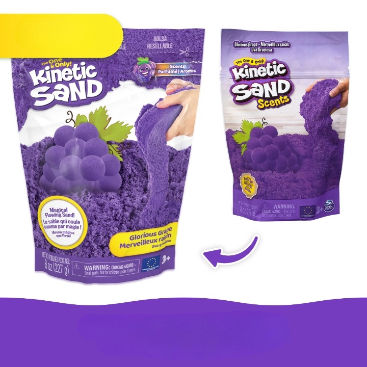 Kinetic Sand Scents bietet ein sinnliches Erlebnis: weicher, formbarer Sand mit einem angenehmen Traubenduft, den Kinder lieben werden. Die spezielle Zusammensetzung hält die Körner zusammen, sodass der Sand weniger streut und das Spielen damit sauber und angenehm ist. Ideal für kreatives Spielen zu Hause – formen Sie Buchstaben, Bauwerke, Sandkuchen und fantasievolle Kreationen.