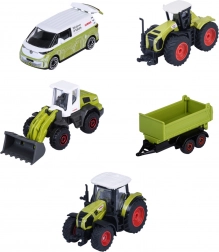 Im Lieferumfang enthalten sind Traktoren, ein Radlader, ein Anhänger und ein VW-Transporter, mit denen sich eigene Szenarien rund um Feldarbeit, Verladung, Transport und Ernte nachspielen lassen. Metallkomponenten erhöhen die Haltbarkeit, bewegliche Teile und frei drehende Räder sorgen für sanfte Bewegungen und ein authentisches Spielerlebnis.