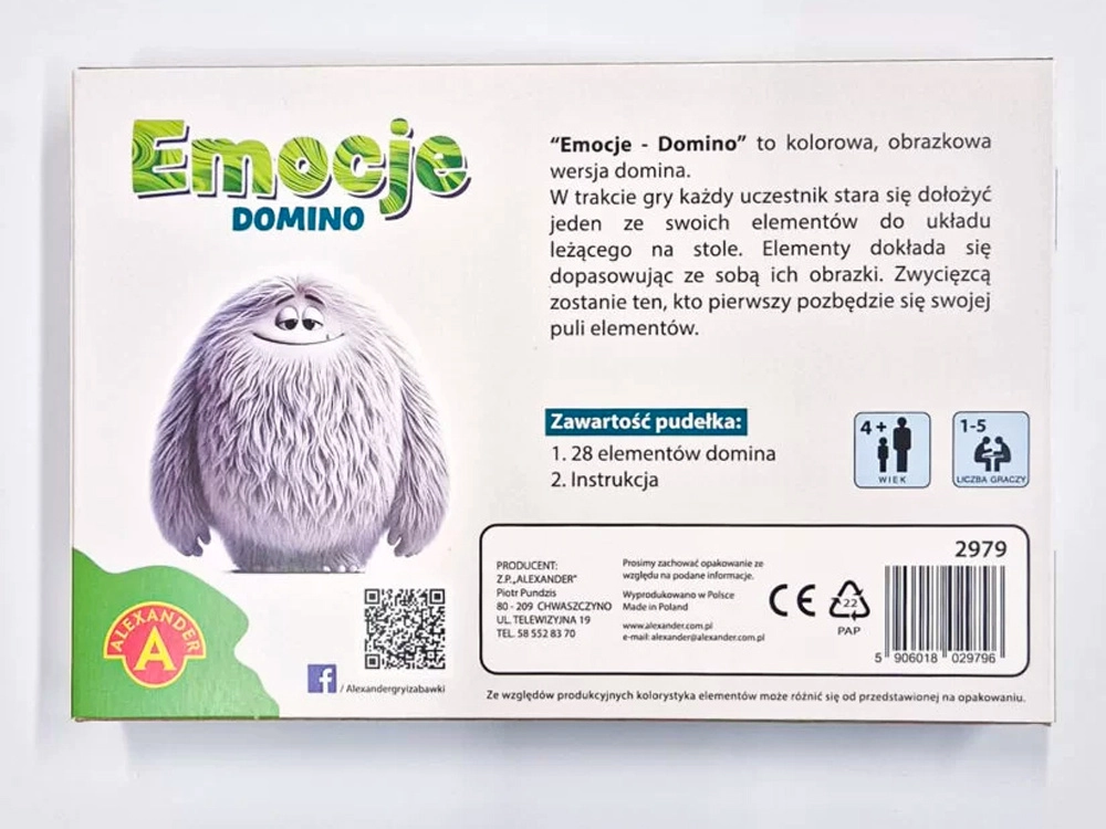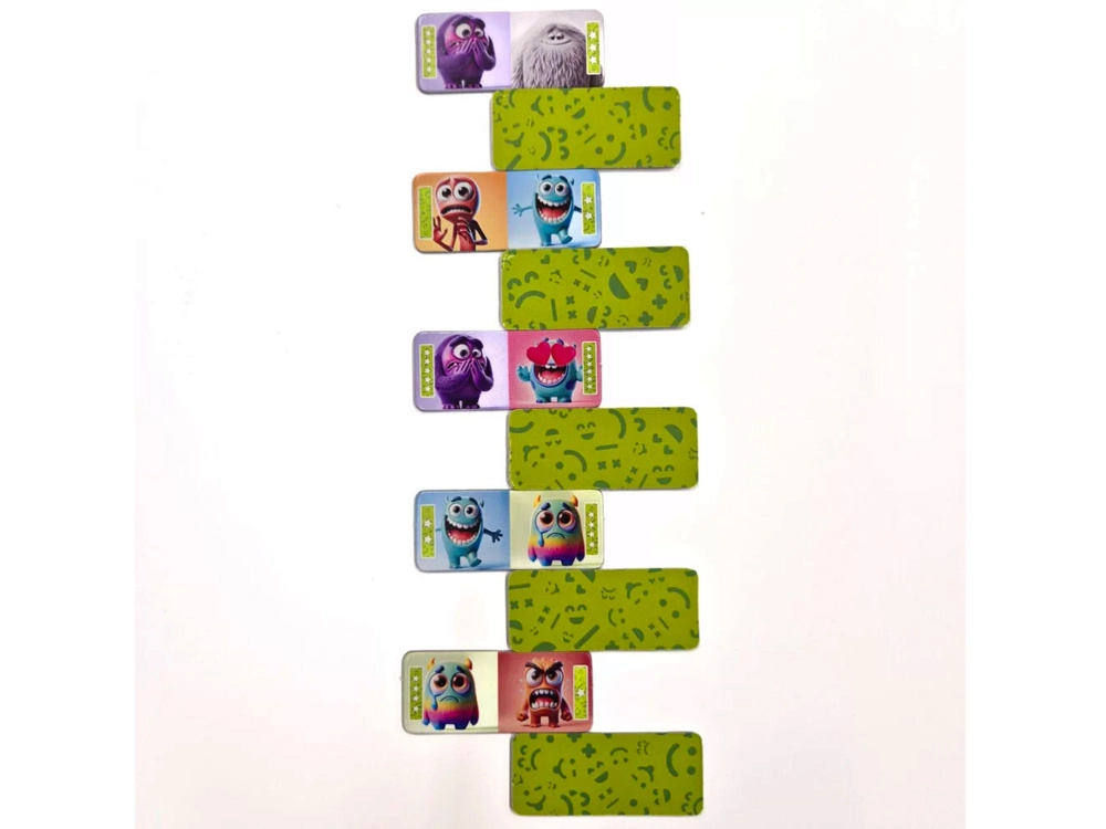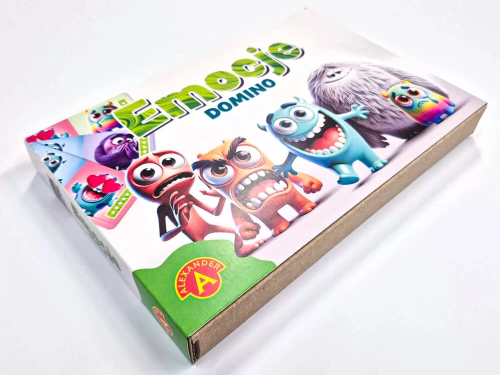 Domino der Gefühle verbindet das beliebte Prinzip des klassischen Dominos mit Illustrationen verschiedener Emotionen – Freude, Traurigkeit, Angst, Überraschung oder Wut. Kinder legen gleiche Gefühle aneinander, lernen sie zu unterscheiden und besser darüber zu sprechen. Das Spiel unterstützt Selbstwahrnehmung, soziale Fähigkeiten und Konzentration.