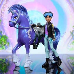 Storm verzaubert mit Zeichen der Wettermagie und einer langen dunkelblauen Mähne und einem Schweif, die mit dem beiliegenden Kamm gekämmt werden können. Abnehmbarer Sattel und Zaumzeug sorgen für einen stabilen Ritt und fließende Übergänge zwischen Posen – perfekt, um eigene Geschichten über Mut und Freundschaft zu erzählen.