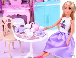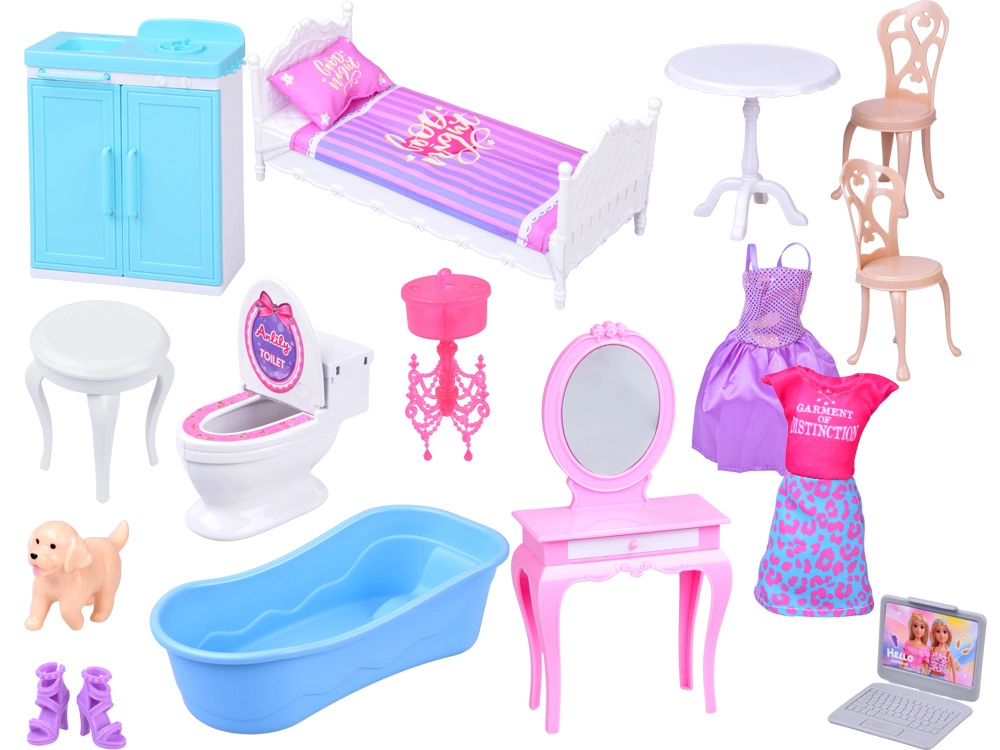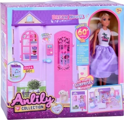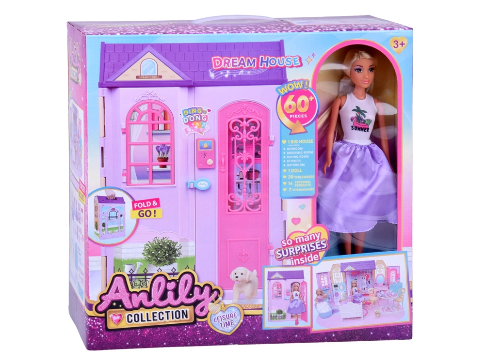 Enthalten sind die Puppe ANLILY mit langen, gut kämmbaren Haaren, Möbel (Bett mit Bettwäsche, Kommode mit Schubladen, Kleiderständer, Badewanne, WC, Schminktisch mit Hocker, Ess-Set), Küchenausstattung und zahlreiche Accessoires für Pflege und Kochen. Öffnende Türen und Fenster, Dekorationen sowie eine batteriebetriebene Klingel unterstützen realistisches Rollenspiel.