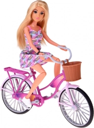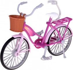 Das pink‑lila Fahrrad mit Vorderkorb, Gepäckträger, Pedalen und Speichenrädern rollt frei und lässt sich leicht steuern. Der Sattel mit Halterung hält die Puppe während der „Fahrt“ stabil.