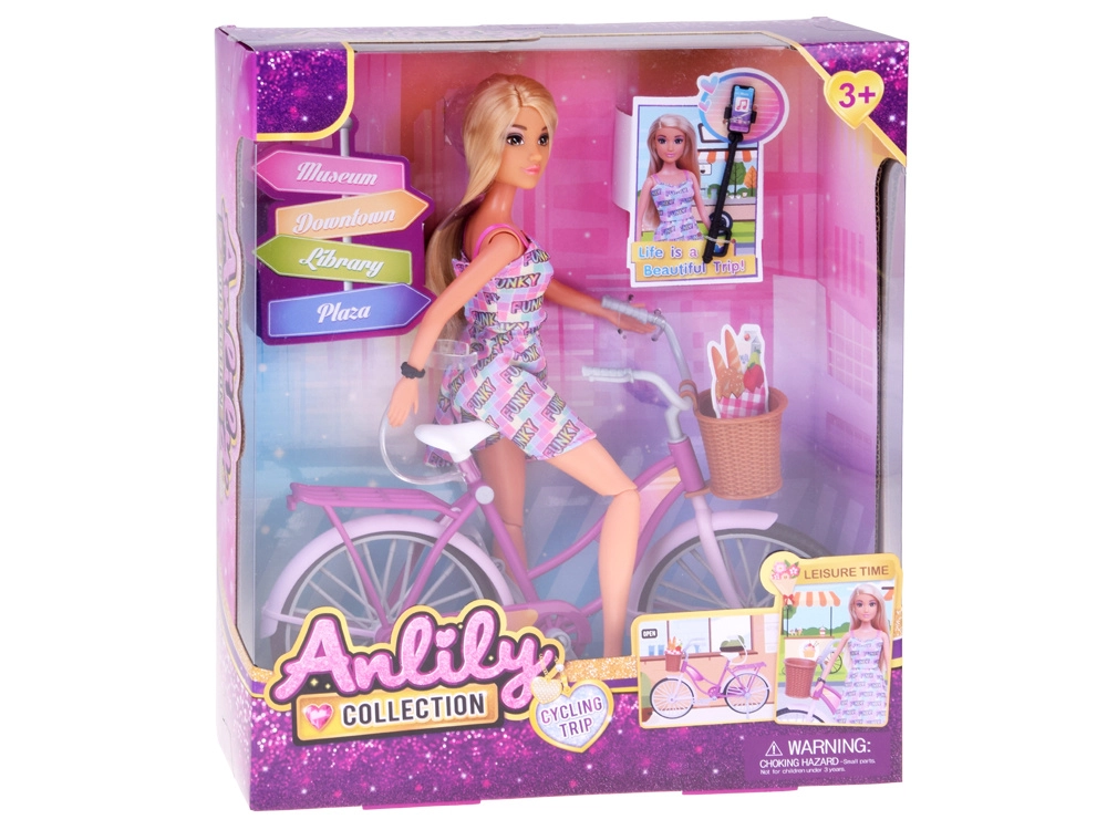 Entdecke die Welt der Fantasie mit der ANLILY Puppe, die Ausflüge durch Parks und Stadtschluchten liebt. Dank der artikulierten Gliedmaßen nimmt sie mühelos Fahr‑ und Selfie‑Posen ein, und ihr farbenfrohes Kleid mit dem Aufdruck FUNKY unterstreicht den modernen Stil. Teil des Sets ist ein detailreich gestaltetes Fahrrad in Pastellfarben für eine geschmeidige Fahrt und einen stabilen Sitz der Puppe.