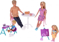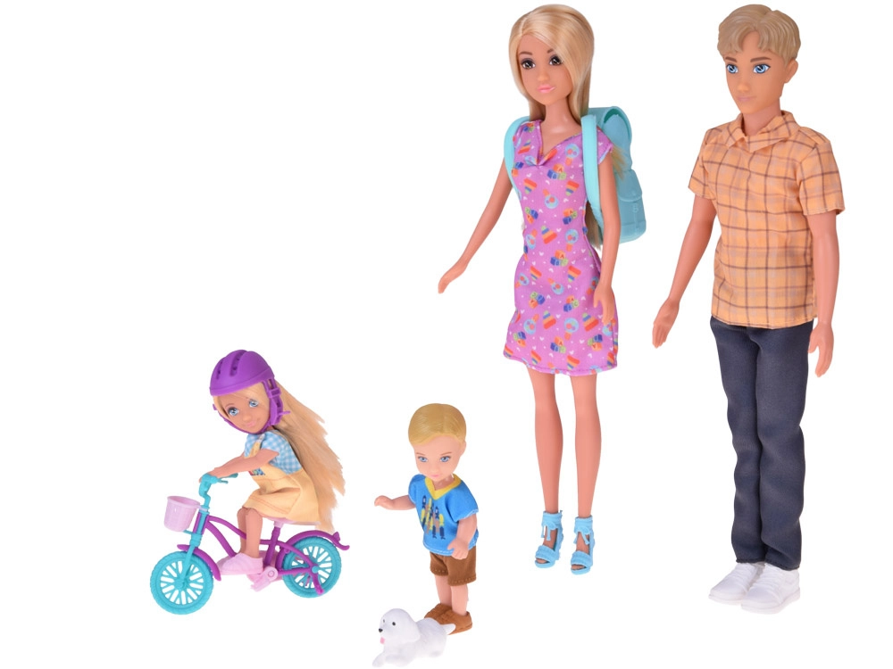 Vier Puppen mit detailreicher Kleidung und beweglichen Gelenken ermöglichen Kindern, Alltagssituationen von Frühstück bis Abendentspannung nachzuspielen. Ein niedlicher Hund ist ebenfalls dabei.