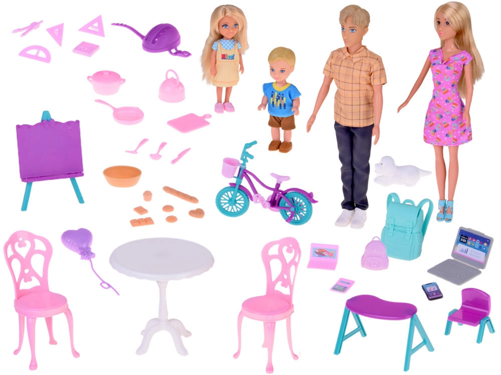 Entdecken Sie das vielseitige ANLILY-Set, das Kreativität, Empathie und soziale Fähigkeiten durch realistisches Familienspiel fördert. Zwei erwachsene Puppen, zwei Kinderpuppen und ein süßer Hund, ergänzt durch Möbel, Schulmaterialien und Arbeitszubehör, schaffen die ideale Umgebung für Rollenspiele aus dem Alltag.
