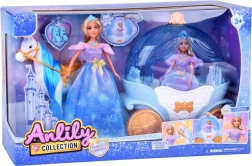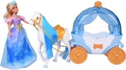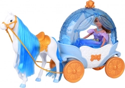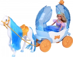 Die „Kürbis“-Kutsche in Blau‑Weiß mit goldenen Akzenten hat eine öffnende obere Abdeckung, sodass die Puppe leicht hineingesetzt werden kann. Das weiße Pferd mit blauer Mähne ist mit Sattel, Zaumzeug und Geschirr ausgestattet, die Kutsche hat bewegliche Räder für eine sanfte Fahrt über den Boden.