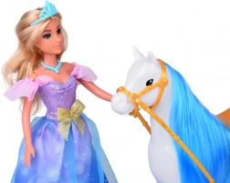 Diese elegante Prinzessin in einem langen Kleid in Blau‑, Lila‑ und Rosatönen mit glänzenden Details und goldener Schleife verzaubert auf den ersten Blick. Dank der langen blonden Haare, des Diadems und der Halskette können Kinder kämmen, anziehen und eigene Märchenszenen erfinden.
