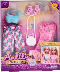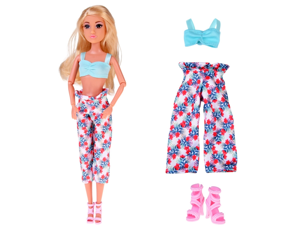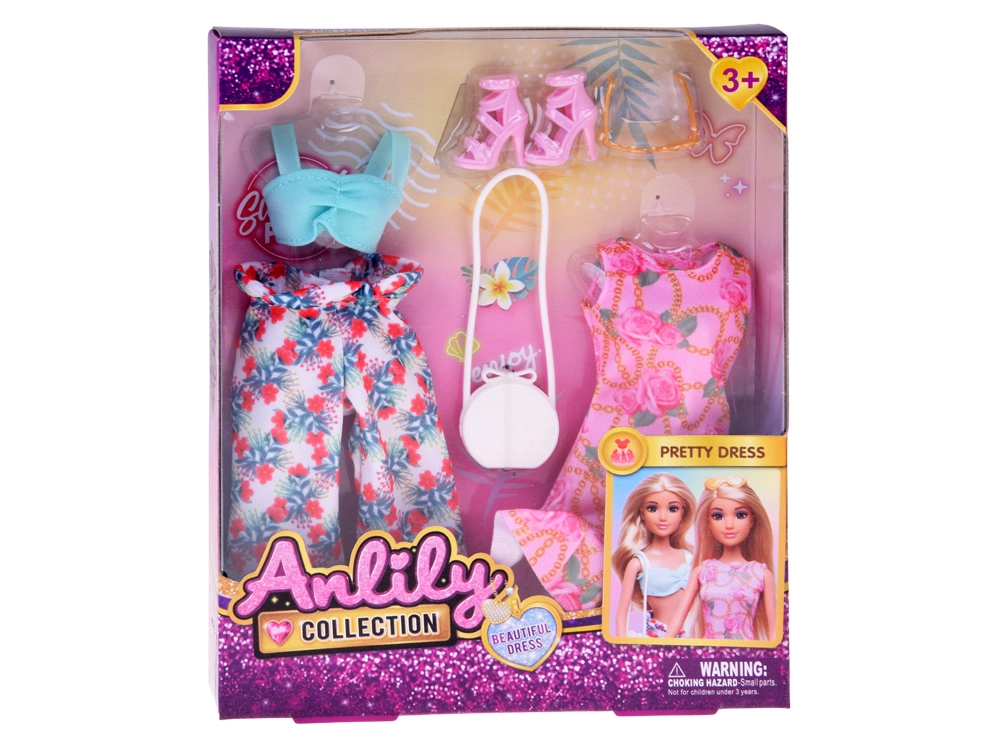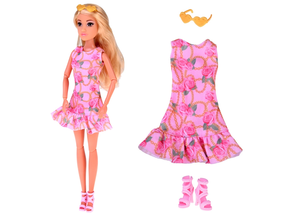 Der Lieferumfang umfasst ein romantisches rosa Kleid mit Blumen- und Kettenmuster sowie ein bequemes türkises Top mit geblümter, weiter Hose. Abgerundet wird der Stil durch rosafarbene Schuhe mit Absatz, gelbe Herzbrille, eine kleine Handtasche und weitere kleine Accessoires. Ideal zum Mixen und Kombinieren von Outfits und zum Spielen als Mode-Stylistin.