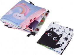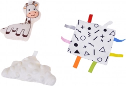 Plüsch-Giraffe, Minky-Wölkchen, sicheres Spiegelchen, knisterndes Quadrat mit Etiketten und kontrastreiches beidseitiges Büchlein fördern Sehen, Hören und Tasten.