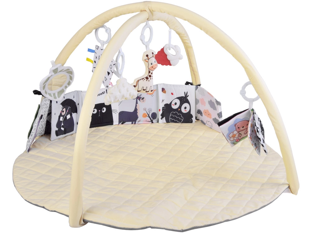 Die zwei flexiblen Bögen lassen sich leicht abnehmen zum Waschen oder für Reisen. An den Ringen hängen verschiedene Spielzeuge, die Sehen, Hören und Tasten fördern: eine Plüsch-Giraffe, ein weiches Minky-Wölkchen, ein sicheres Spiegelchen, ein kontrastreiches beidseitiges Büchlein, ein knisterndes Quadrat mit Labels sowie ein Beißring. Kontrastreiche Motive und unterschiedliche Texturen unterstützen Konzentration und Hand-Auge-Koordination.