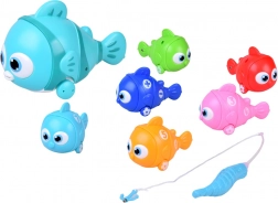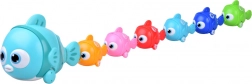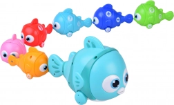 Der große Fisch zieht die angehängten kleinen Fische hinter sich her. Alle haben Räder, sodass sie sanft über den Boden rollen und ein flüssiges Spiel ermöglichen.