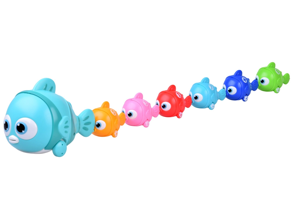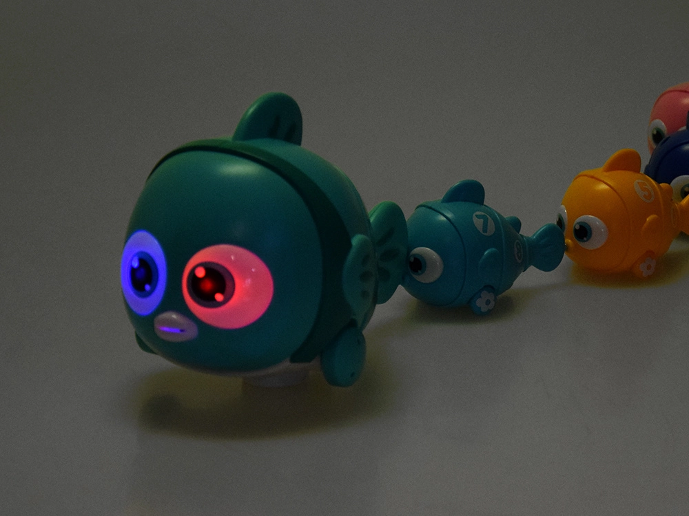 Die interaktive Fischfamilie bietet viele Spielmöglichkeiten zu Hause und auf glatten Böden. Der batteriebetriebene große Fisch fährt nach Drücken der Rückenflosse nach vorn, seine bunten Augen leuchten und er spielt eine fröhliche Melodie. Die kleineren Fische haben Magnete im Maul und im Schwanz, sodass sie sich leicht zu einem langen Zug verbinden lassen und auf Rädern dem großen Fisch hinterherfahren.