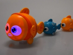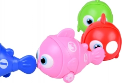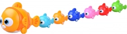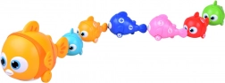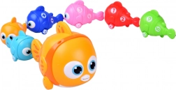 Die interaktive Fischfamilie macht jeden Tag zu einem kreativen Abenteuer. Der batteriebetriebene Großfisch fährt vorwärts, lässt die Augen leuchten und spielt Musik, während die kleineren Fische dank der Magnete an Schwanz oder Maul andocken und einen bunten Wasserzug bilden. Jeder kleine Fisch ist mit Zahlen bedruckt, sodass Kinder Zählen und einfache Sequenzen üben können.