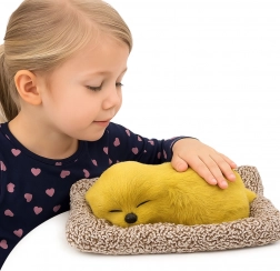 Dieser detailreich gestaltete schlafende Labrador imitiert treu ein Welpe, das auf seinem Körbchen ruht. Die Oberfläche aus weichem, fellähnlichem Material wirkt realistisch und fühlt sich angenehm an. Die kompakten Maße passen auf ein Regal, den Schreibtisch oder ins Kinderzimmer.