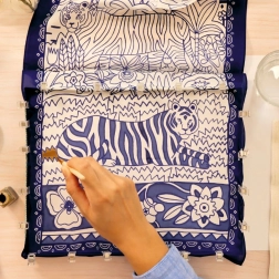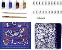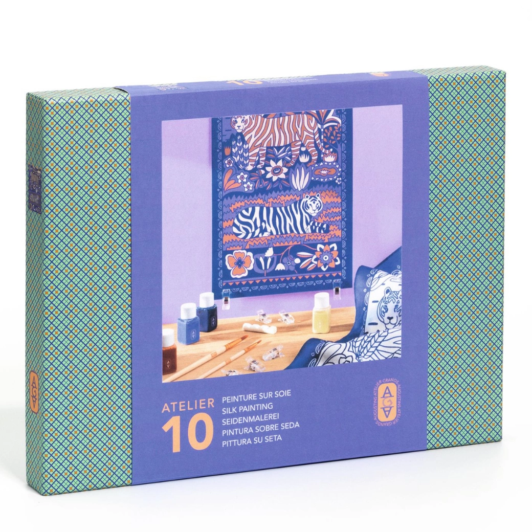 Das Set Seidenmalerei Atelier 10 von DJECO bietet alles, was Sie für ein wunderschönes, handbemaltes Tuch benötigen. Vorgedruckte Konturen mit Tiger- und floralen Motiven führen den Pinsel und erleichtern exaktes Ausmalen – damit ist das Projekt auch für absolute Anfänger geeignet. Dank hochwertiger Textilfarben erzielen Sie satte Farbtöne und sanfte Verläufe.
