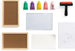 Praktisch zusammengestelltes Set mit Gelplatte, Walze, fünf Farben und Papieren – Sie können direkt nach dem Auspacken loslegen.