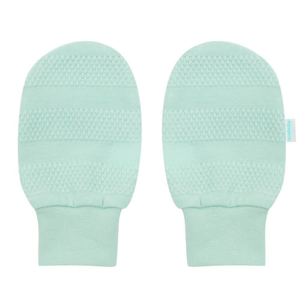 Mützchen mit breiterem Bund sitzt gut, Fäustlinge verhindern Kratzen und Schühchen bleiben am Füßchen – alles stimmig im Mint-Ton.