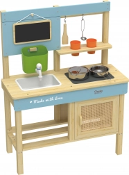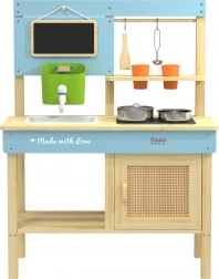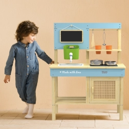 Diese hochwertige Kinderküche besteht aus zertifiziertem Naturholz und ist ohne scharfe Kanten gestaltet – für sicheres Spielen ab 3 Jahren. Dank der robusten Konstruktion und des durchdachten Layouts mit Haken und Regalen können Kinder Geschirr und Zubehör einfach verstauen. Die kleine Tafel dient als Menü oder Aufgabenliste – Kreide genügt und der Fantasie sind keine Grenzen gesetzt.