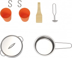 Im Set enthalten: Töpfe mit Deckeln, 2 Becher, Pfannenwender, Löffel, Aufhängehaken, Kreidetafel sowie die grundlegende Küchenausstattung (Spüle, Kochplatten, Regale). Die perfekte Wahl für Outdoor- und Indoor-Spielbereiche kleiner Köchinnen und Köche.