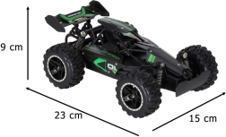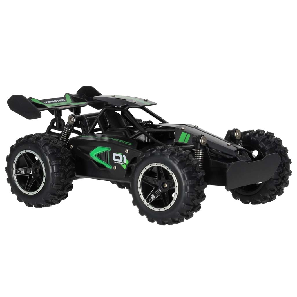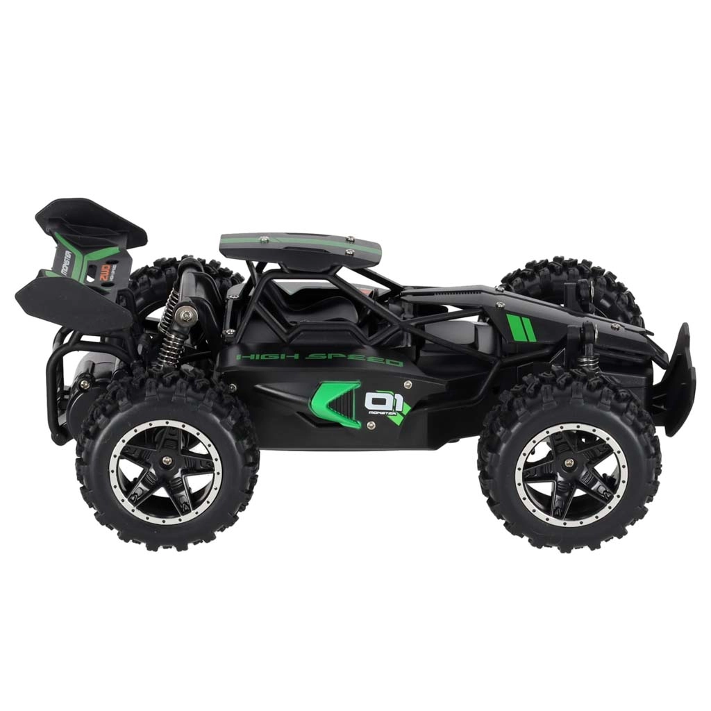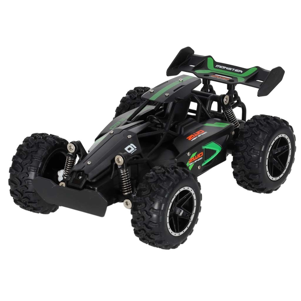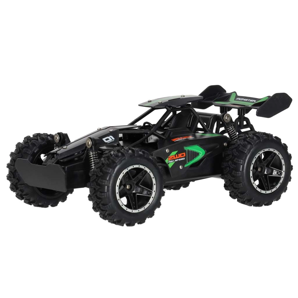 Dank hoher Bodenfreiheit, Federdämpfern und großen Reifen mit grobem Profil kommt das Auto mit Unebenheiten, Staub und kleinen Hindernissen zurecht. Ideal für Einsteiger, die ein schnelles und leicht zu steuerndes Auto möchten, und für Fortgeschrittene, die dynamisches Fahren im Gelände suchen.