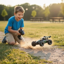 Leichtes und wendiges RC‑Auto mit Pistolenfernsteuerung für sanftes Vorwärts/Rückwärtsfahren und präzises Lenken. Moderne 2,4‑GHz‑Technologie sorgt für ein stabiles Signal und eine komfortable Reichweite von etwa 40 m, sodass Sie sich nicht mit anderen Fahrern stören. Der wiederaufladbare Akku bietet 12–15 Minuten Fahrzeit, das Laden dauert etwa 1,5–2 Stunden.