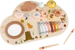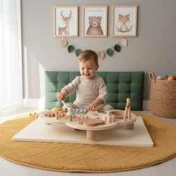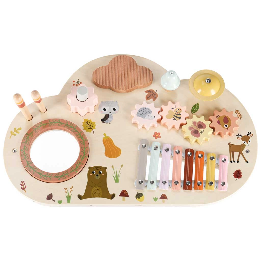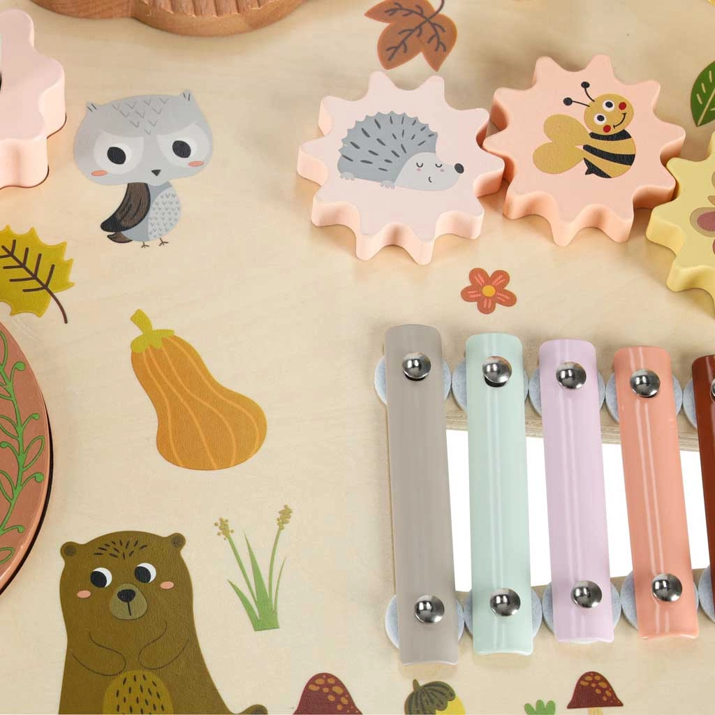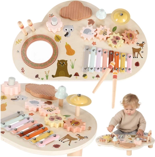 Dieser musikalische Holztisch ist ein echtes Aktivitätszentrum – Kinder können mit Schlägeln klopfen, Zahnräder drehen, Texturen erkunden und erste Melodien komponieren. Jedes Element fördert die Entwicklung des Hörsinns, die Hand-Auge-Koordination sowie die Feinmotorik und bringt Freude am Entdecken.