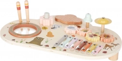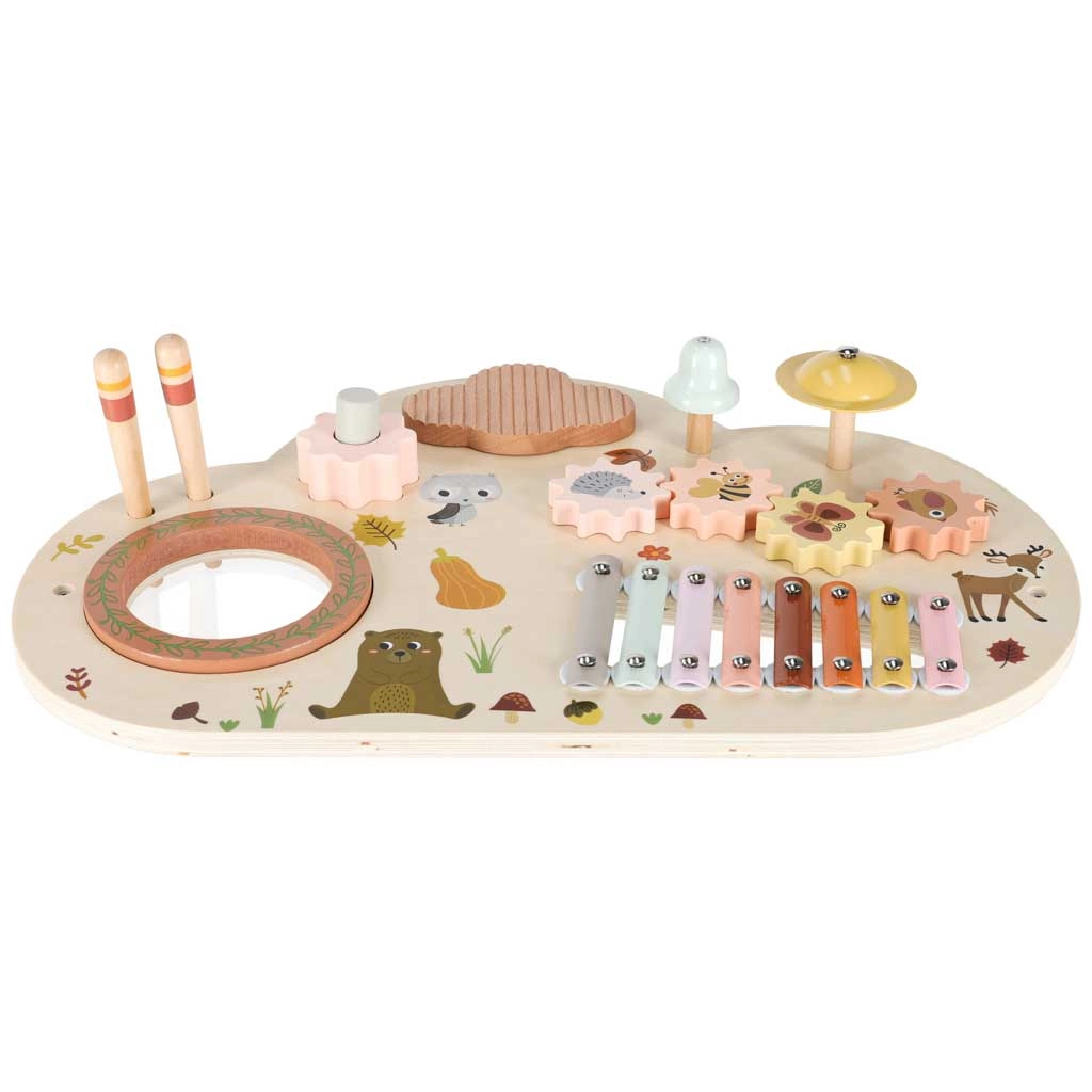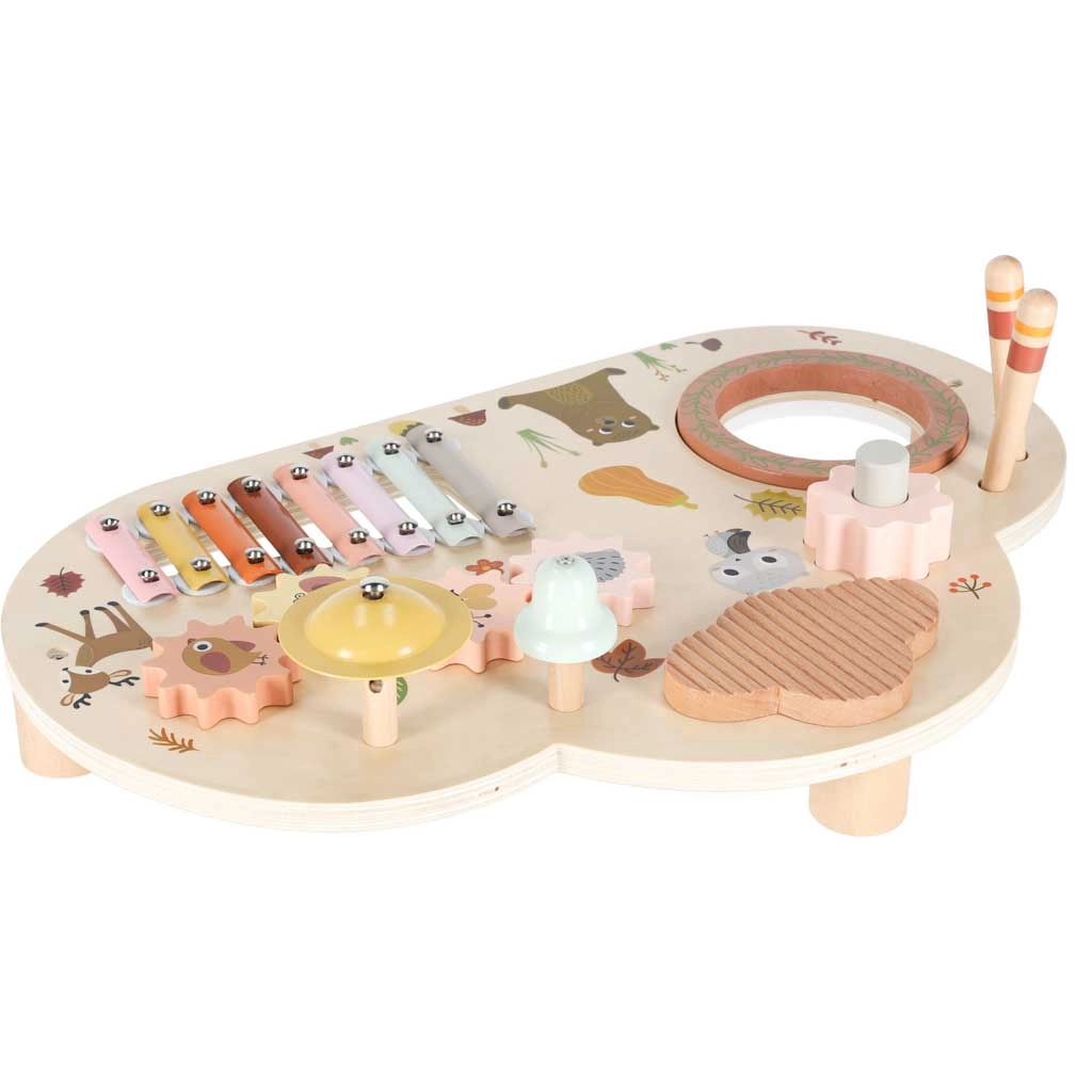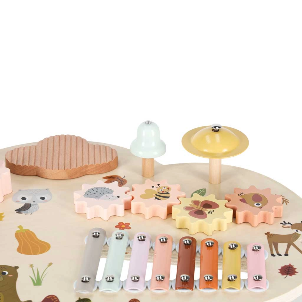 Niedrige Beine und eine robuste Platte aus Naturholz sorgen für Stabilität beim Klopfen, Drehen und Klatschen – ideal für Kleinkinder.