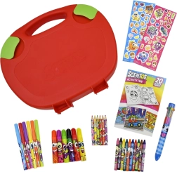 Im Inneren finden Sie ein umfangreiches Set an Kreativmaterialien in leuchtenden Farben: duftende Filzstifte, duftende Buntstifte, Wachsmalstifte, Malbücher mit fröhlichen Figuren und bunte Aufkleber zur Gestaltung der Kunstwerke. Alles ist so konzipiert, dass es ungiftig ist, gut in Kinderhände passt und zur Entwicklung von Fantasie und Feinmotorik motiviert.