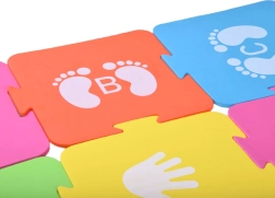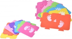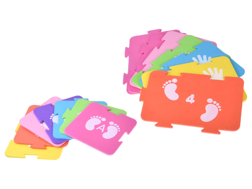 Jedes Teil ist mit weißen Abdrücken, Buchstaben und Zahlen bedruckt. Kinder trainieren spielerisch Orientierung, Gedächtnis und Logik.