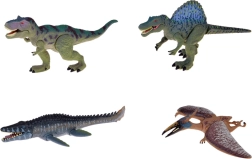 In der Packung finden Sie vier verschiedene Arten: Pterodaktylus (fliegt und bewegt Kopf sowie Hintergliedmaßen), T-Rex (schnappt bedrohlich mit den Kiefern und bewegt Vorder- und Hintergliedmaßen), Spinosaurus (bewegt Kiefer, Gliedmaßen und Schwanz) und Kronosaurus (öffnet das Maul und bewegt die Flossen). Jede Figur besteht aus hochwertigem, strapazierfähigem Kunststoff, der häufiges Spielen mühelos aushält.