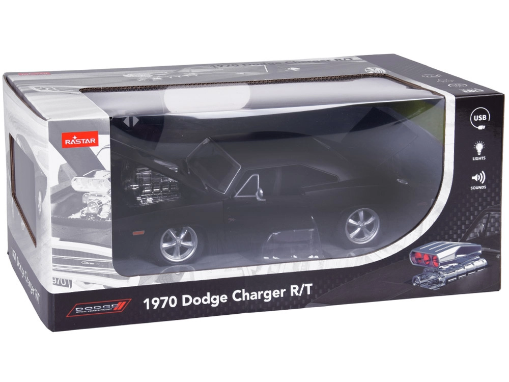 Die Straßenikone der 70er jetzt in Ihrer Hand. Dieses ferngesteuerte Modell bewahrt die charakteristischen Linien des originalen CHARGER R/T und ergänzt sie um beeindruckende orange und rote Beleuchtung sowie Motorsound und Reifenquietschen, die das Fahrerlebnis intensivieren. Dank der öffnenden Elemente werfen Sie einen Blick in den detailliert gestalteten Innenraum und unter die Haube.