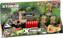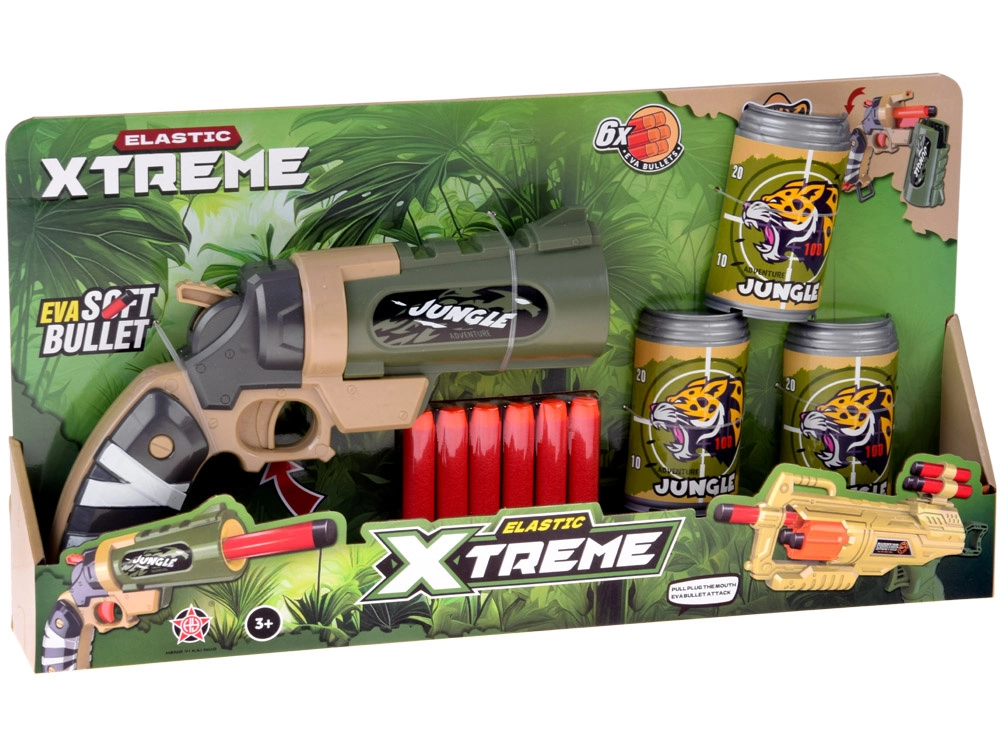 Das JUNGLE-Set ist die perfekte Wahl für actionreiche Spiele draußen und drinnen. Die leichte, robuste Pistole liegt gut in Kinderhänden, die weichen Schaumstoffschüsse mit Gummispitze sorgen für mehr Sicherheit und die Dosenziele motivieren zum Training der Treffsicherheit. Einfach laden, zielen und die Ziele umwerfen.