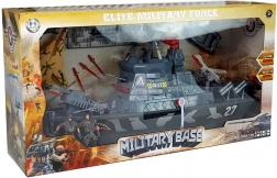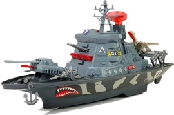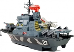 Dieses detailliert gestaltete Militärschiff wird zum Mittelpunkt jeder Kinderflotte. Vier Funktionstasten starten verschiedene Kombinationen aus Licht und Sound – vom Meeresrauschen über Schüsse und Alarme bis hin zur Stimme des Kapitäns auf Englisch. Das drehbare Radar mit Licht und die bewegliche Bewaffnung am Bug intensivieren das Spielerlebnis.