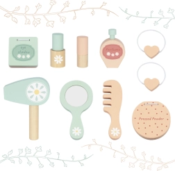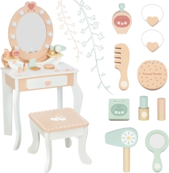 Enthalten ist eine breite Palette an hölzernem Zubehör – von „Kosmetik“ über Kamm bis Föhn – die keine echten Kosmetikprodukte sind und daher für das Spiel geeignet und sicher sind. Der Schminktisch fördert Feinmotorik, Selbstständigkeit, logisches Denken und Fantasie.