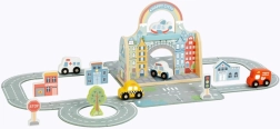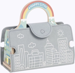 Dieses kreative Holzset verwandelt jeden Tisch in eine lebhafte Stadt. Die Straßen aus Filz lassen sich leicht zu verschiedenen Routen legen, das kleine Auto fährt durch das Stadttor, an einer Ampel und Verkehrsschildern vorbei. Die tragbare Konstruktion in Form einer Tasche ermöglicht, die ganze Stadt mitzunehmen – zu den Großeltern oder in den Urlaub.