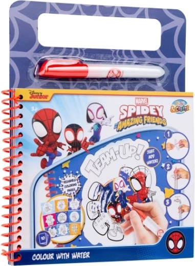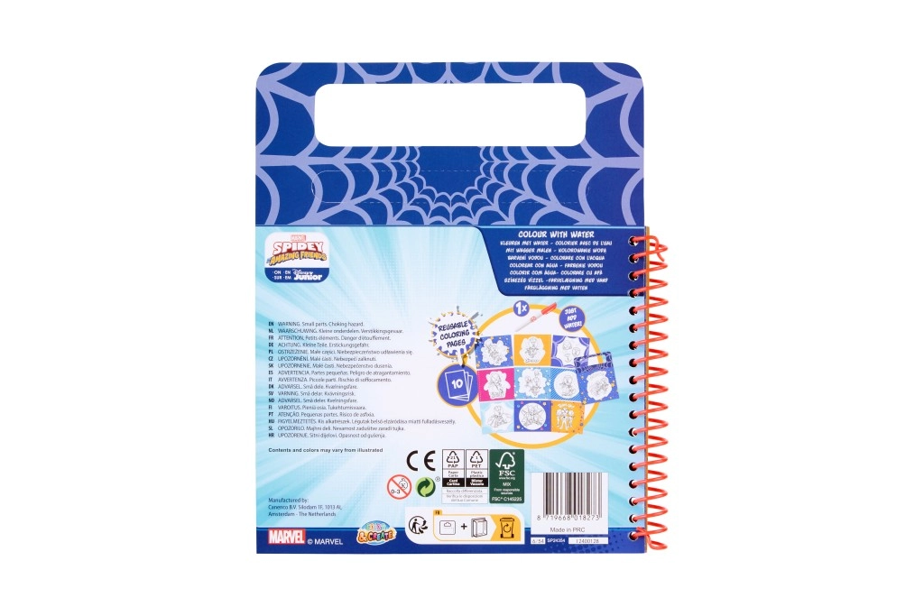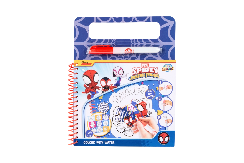 Dieser portable Wasser-Malblock im Format A5 bietet Kindern ein einfaches und sauberes Ausmalerlebnis. Einfach den Wasserstift füllen, über die Seite streichen und verborgene Farben mit beliebten Helden aus der Welt von SPIDEY erscheinen sofort. Sobald das Blatt trocknet, verblassen die Farben, und das Kind kann immer wieder neu malen.