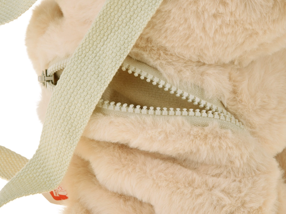 Dieser flauschige Rucksack in Form eines beigefarbenen Bären vereint Spielzeug und praktisches Gepäck in einem. Farbige Details an Pfoten und Ohren, ein gesticktes Lächeln und die kuschelige, flauschige Oberfläche fördern die Fantasie der Kinder und den Tragekomfort. Die versteckte Reißverschlusstasche bietet Platz für kleine Schätze, Snack oder Taschentücher.