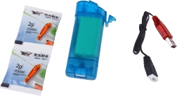 Enthalten sind ein 7,4 V 500 mAh Akku, ein USB-Ladegerät und zwei Beutel zur Herstellung von fluoreszierendem Wasser für eindrucksvolle Nacht-Action.