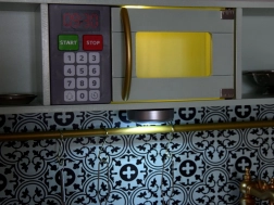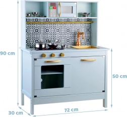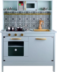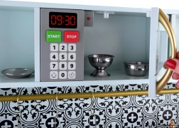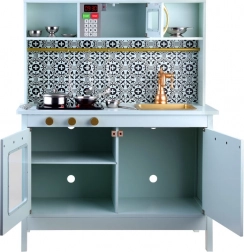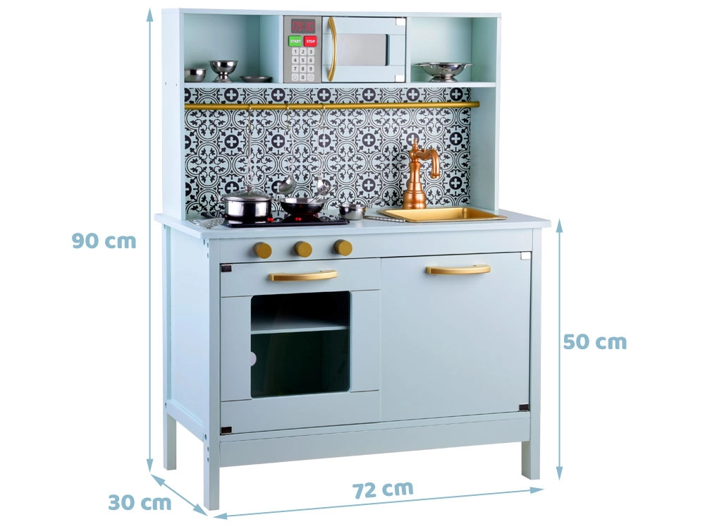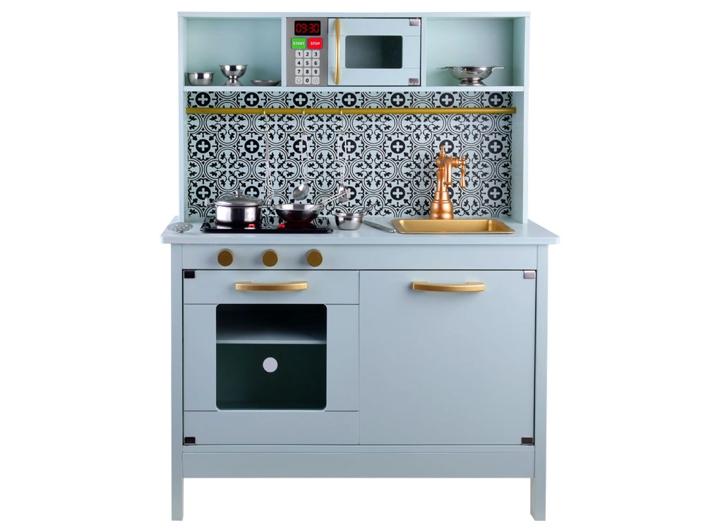 Diese elegante Kinderküche in Mint mit schwarz-weißer Mosaikoptik überzeugt durch hochwertige Verarbeitung aus Holz und MDF. Realistische Elemente wie die Induktionskochplatte mit Licht und Sound, die Mikrowelle und der Backofen mit transparenter Tür ziehen Kinder in die Welt der Fantasie und des Rollenspiels.